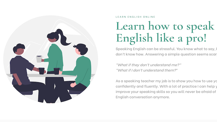An online platform offering personalized 1-on-1 English lessons with professional tutor. The site focuses on improving speaking skills through real-time sessions tailored to individual needs.